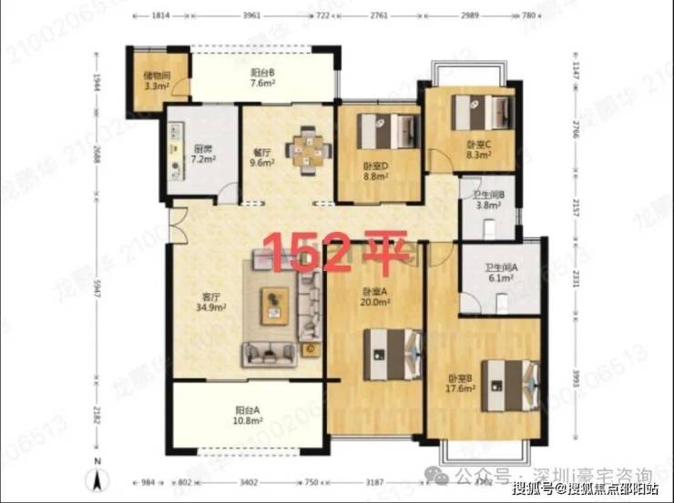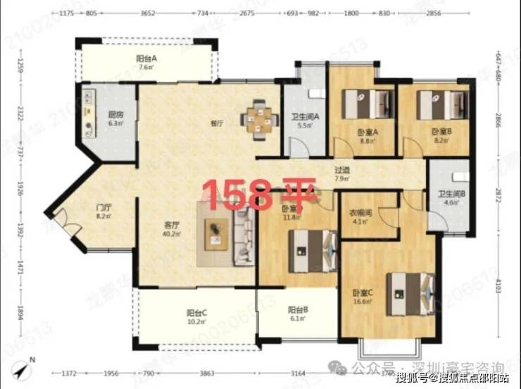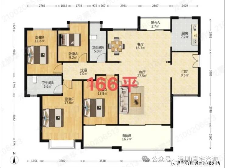 这是01户型166平5房2厅,两梯三户,进门送入户,南北通双阳台,前后景观无摭挡,原始5房结构,这个户型里面房间更大,北面阳台会小些,小区中心位置安静,私密性高。