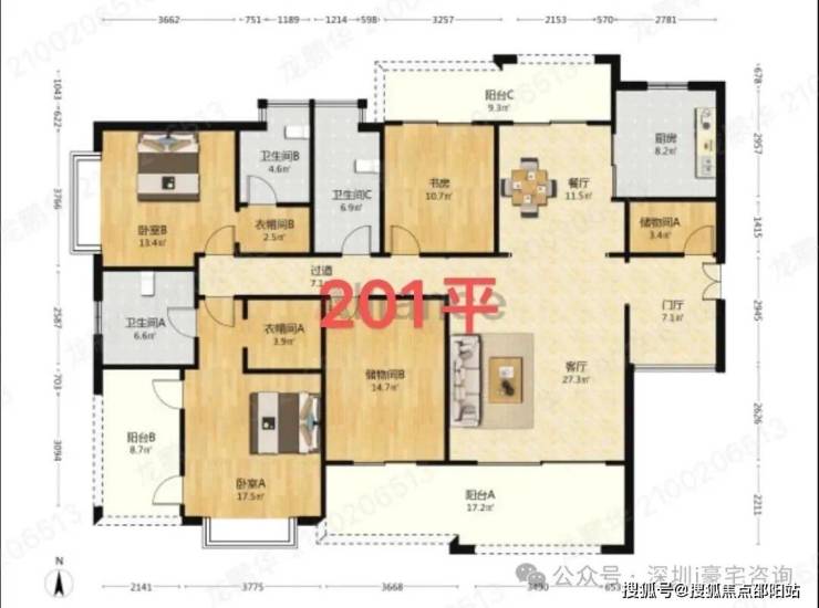 这个是55栋01户型,201平4房2厅,高层(33层)两梯三户,进门送入户,南北通双阳台,前后景观无摭挡,原始5房结构,小区最大平层,空间阔气。特点:私密性强,最靠山位置,主卧有阳台全方位景观好。