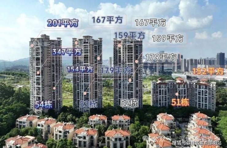 高层有52,53,55栋,两梯三户,其中52,53栋面积158-179平四到五房,55栋两梯三户,面积154-201大平层和347平复式