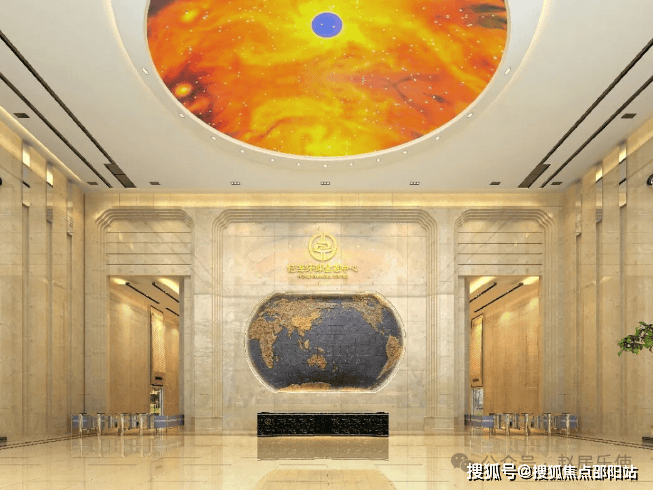 大堂高14.25米,面积510平方米,顶部设计如星空穹顶,搭配朱炳仁大师手工打造的世界地图铜雕,营造出高端商务氛围。