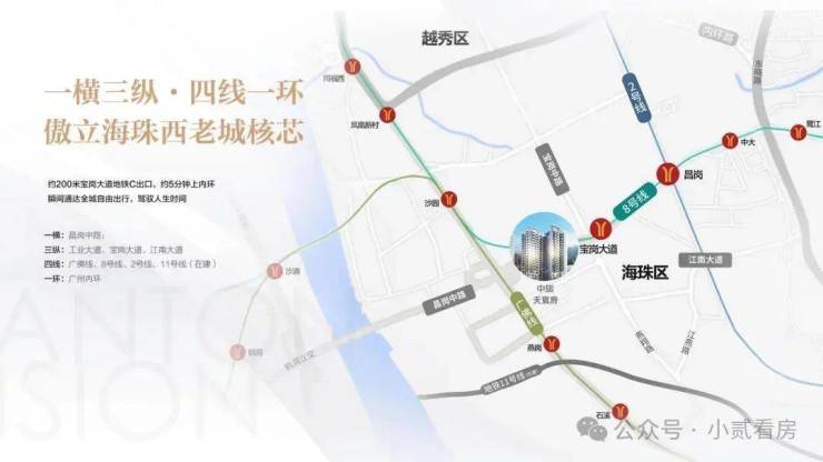 距地铁8号线宝岗大道C出口站约200米,5min上内环,交通便利,全城通达性高;步行500米即达省级名校昌岗中路小学,临近乐峰广场、太古仓、南方医科大学珠江医院等成熟生活配套。