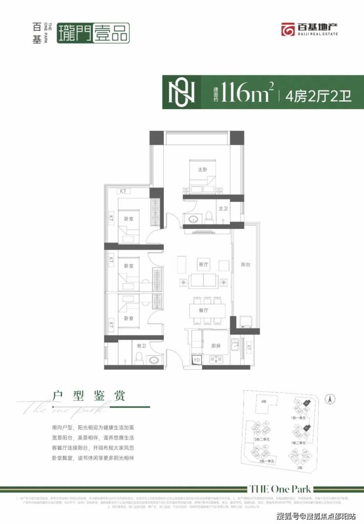 116㎡的4房2厅2卫,设计的是横厅南北通透格局,进门入户玄关,客餐厅6米开间,LDKB一体化设计,五开间朝南,4个卧室分别做到了3.775米/3.2米/2.6米/2.575米的宽度,主卧三面飘窗,6米长的大阳台,L型厨房,卫生间干湿分离,得房率:70.65%(不含赠送),阳台主朝东南向。
