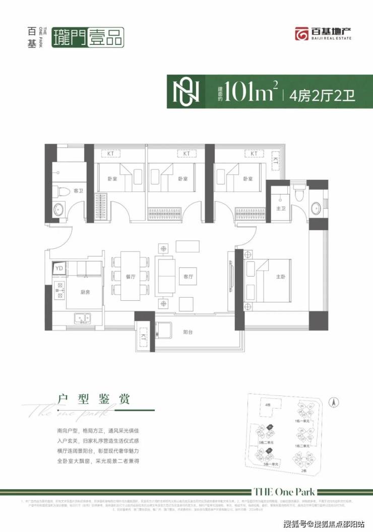 101㎡的4房2厅2卫,设计的是横厅南北通透格局,进门入户玄关,客餐厅5.55米开间,LDKB一体化设计,四开间朝南,4个卧室分别做到了3.85米/2.6米/2.4米/2.35米的宽度,主卧270°双飘窗,U型厨房,卫生间干湿分离,得房率:71.29%(不含赠送),阳台主朝东南向。