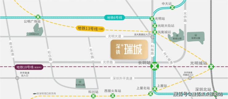 深铁瑞城,位于深圳市光明区凤凰街道长圳地铁站上盖,处于光明科学城产业转化区核心位置。该区域被定位为"光明版南山粤海街道",是广深港澳科技创新走廊的重要节点,紧邻光侨路主干道,串联起光明云谷、科学方舟、华星光电产业集群等区域,形成光明区的"深南大道" 。