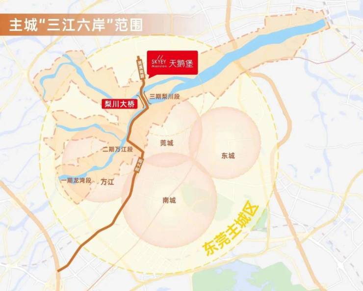 项目占据梨川大桥起点莞潢路,北接环城北路,东接东城中路延长线,南连梨川大桥接驳东江大道、莞太路,并且占位R6线高埗站,全线贯穿主城区至水濂山站,无缝对接四大城区。