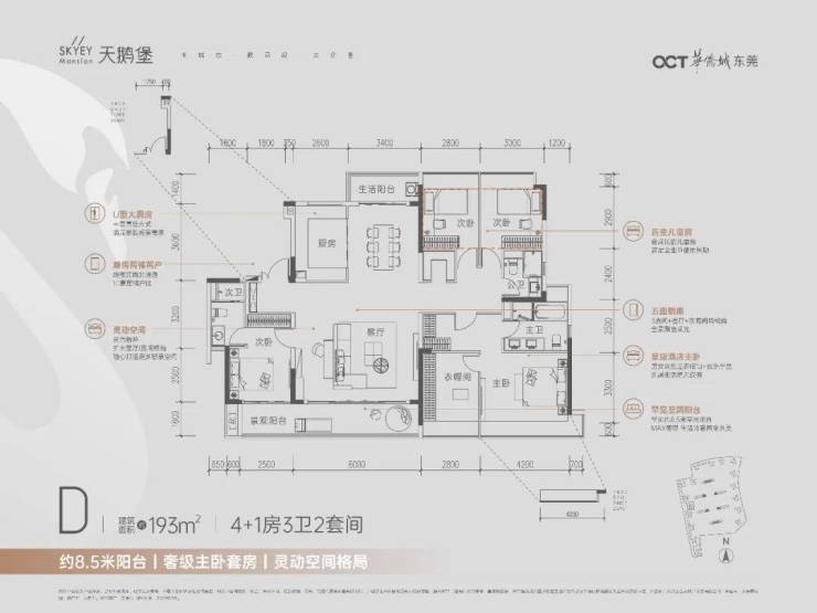 (建面约)193㎡4+1房,打造罕见的入户子母门,美观大气;约8.5米豪居级阳台,奢享MAX景观;主卧自带男女双独立衣帽间+双洗手盆的星级配套,匹配峯层人士的尊贵地位。