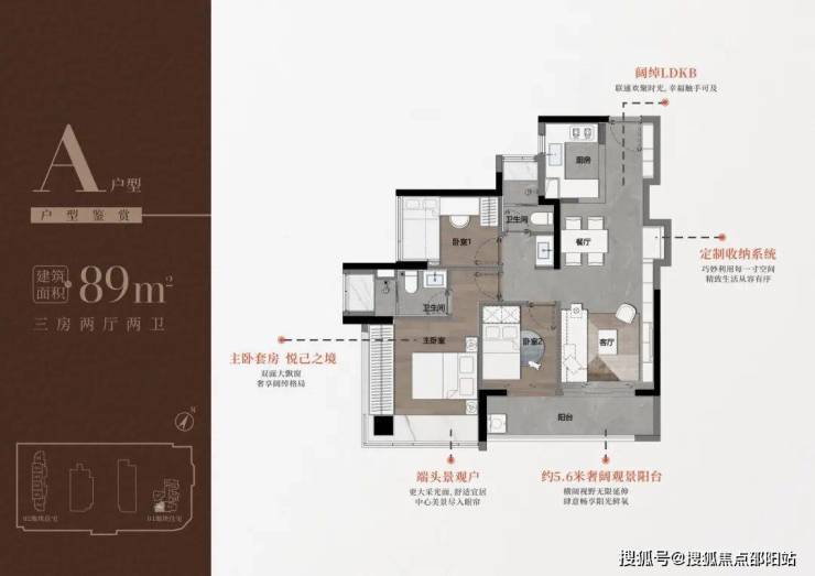 89㎡的3房2厅2卫,A户型(1栋1单元06户型),设计的是经典竖厅格局,进门入户玄关,LDKB一体化,S墙设计预留冰箱卡槽位,三开间朝南,动静分区,主卧双面大飘窗,客厅连接次卧出5.6米长的观景阳台,U型厨房,公卫三段式分离,得房率76.78%(不含赠送),套内面积69.1㎡,东南朝向。