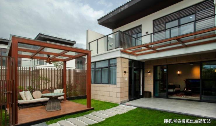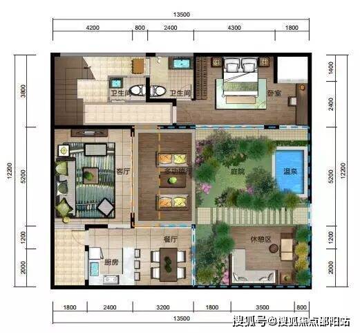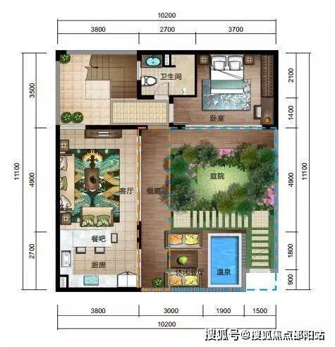 ● 一层大面积私家院落,坐享绿茵温泉,露天庭院里邂逅东方风情;