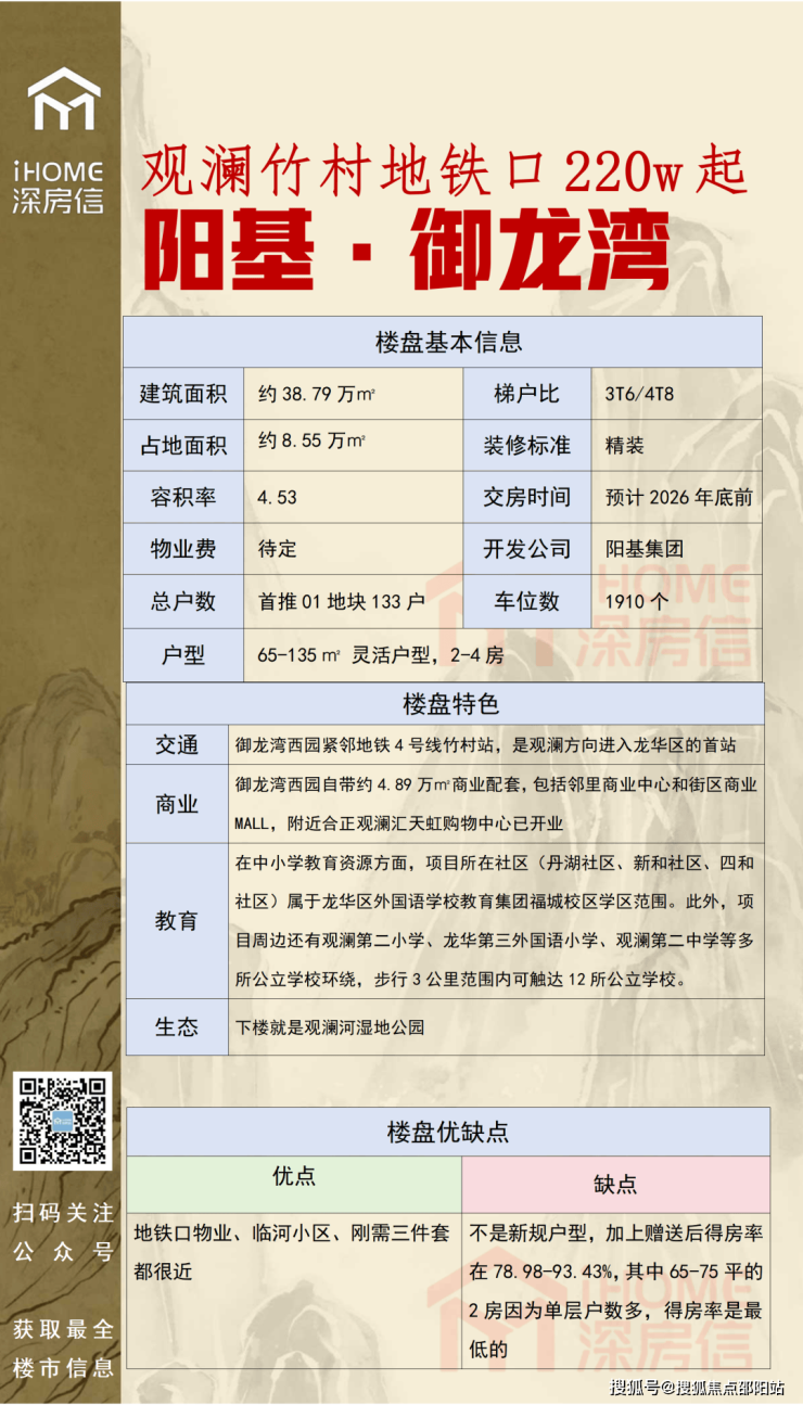 阳基御龙湾原为竹村城市更新项目,总占地面积约8.6万㎡,总建筑面积约38.8万㎡,共分2个地块开发,综合容积率4.5,总规划超2600户,涵盖品质住宅、商业办公、幼儿园为一体的综合体。
