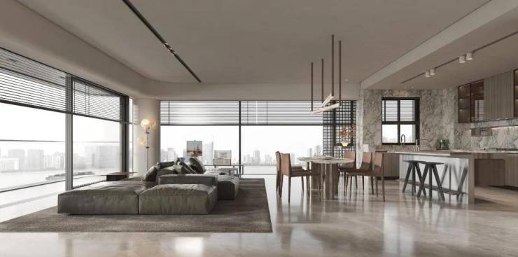 这意味着人们坐在沙发上、躺在床上,偏头就能看见园林景观和城市天际线,而不是只有走到阳台才能一览风采。