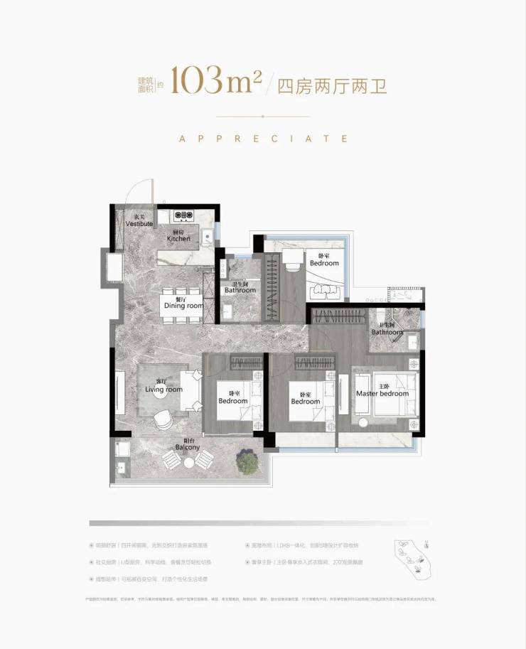 建面168平四房三卫,放大版的142平,做了双主套,适合三代同堂家庭,单边位,南北对流采光通风都非常好,约40平的大房厅,景观阳台开间约8.2米.