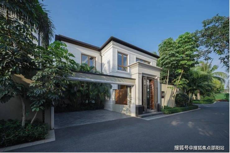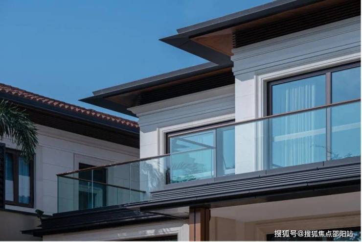 海棠潮鸣别墅统一采用二层造型,形体比例舒适宜人,墙面以仿石涂料为主,突出的门头位置采用葡米石材,主体以均衡的虚实比例及考究的细部线条营造价值感。屋顶采用仿柚木铝合金的深远挑檐及平坡结合的方式,打造热带风情和度假氛围。