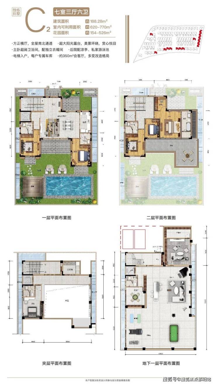 独栋别墅:建筑面积 126 ㎡--396 ㎡,实际使用面积281-766㎡,精装交付,花园面积84-282㎡