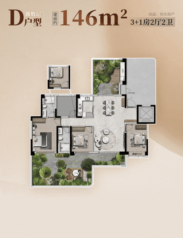 先看建面约146㎡户型,拥有宽敞电梯厅、独立归家动线,彰显尊贵仪式感。