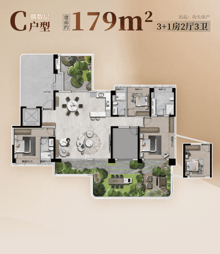 建面约179㎡户型,空间尺度感更上一个台阶。