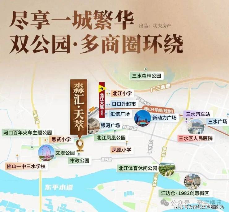 项目落子瑧熟的北江新区,承袭自昔日的三水县衙——河口,百年火车站、海关、邮局皆为其深厚底蕴的见证。如今,北江新区已焕新成为占尽天时地利的宜居板块。