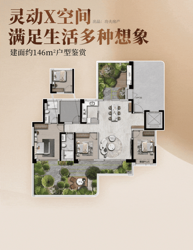 146㎡是一个“魔方户型”,客厅预留一处灵动空间,既能随心打造瑜伽房、阳光书房、电竞房、家庭影音室等,也能打通成为大宽厅。