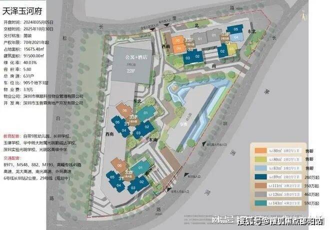 项目位于光明区玉塘街道松白路与长圳路交汇处东北侧,项目总占地面积15675.48㎡,建筑面积91500㎡,绿化率40%,容积率5.8。天泽玉河府规划共4栋48层,总房源631户,有905个车位,户型面积80-143㎡;2栋3梯5户,1栋3梯6户布局。天泽玉河府开盘时间2024年6月,交楼时间2025年10月30日,精装交付,备案价万3.6/㎡,管理费3.5元。