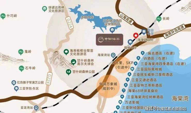 海棠湾是海南唯一一个由国家规划打造的度假湾区,定位为国家海岸,22公里海岸线汇聚千亿配套,32家超五星级酒店、4大主题乐园、5大高尔夫球场、310解放军医院海南分院、亚洲最大单体免税店、华润超级万象城、北京华联SKP等资源环伺。中御海棠项目位于海棠湾南田片区,坐享东线高速、山海高速、机场、高铁、城际公交等三维立体交通网,度假生活出行四通八达。
