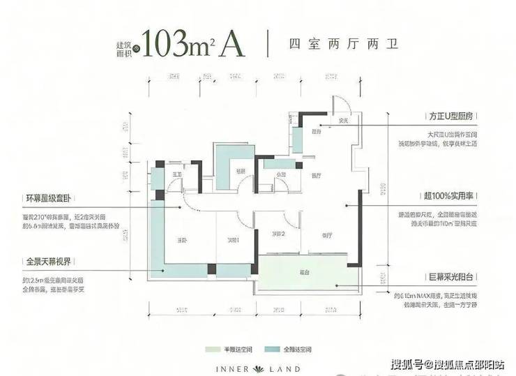 103㎡的4房2厅2卫,设计的是竖厅格局,客厅3.5米开间,LDKB一体化,S墙设计预留冰箱卡槽位,四开间朝南,动静分区,主卧270°无柱转角飘窗,分别做到了主卧18.63㎡/次卧10㎡/次卧8.48㎡/次卧7㎡(包含墙体飘窗),U型厨房,卫生间干湿分离,超100%得房率(包含赠送),客厅连接次卧出6.15米长的大阳台,东南或西南朝向。