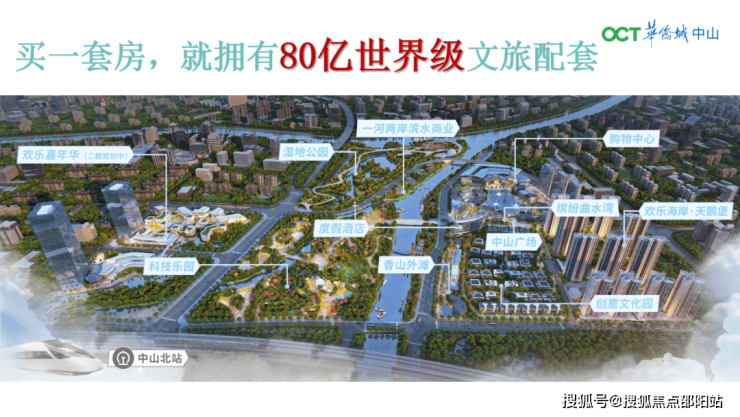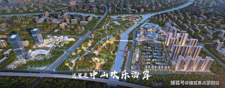华侨城欢乐海岸坐落于岐江河边,总占地近30万方,投资约80亿元,规划了缤纷曲水湾商业街、时尚综合体、度假酒店、科技乐园、创意文化园、乐活居住区、生态湿地公园等不同功能和业态板块,为中山带来一张全新的城市名片,2024年建成开放。