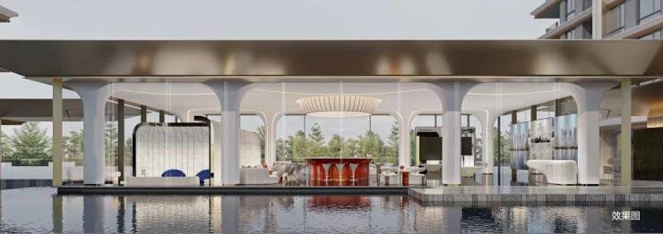 汲取曼谷四季酒店灵感,无边际泳池将奢华建筑与野奢景致自然相融,分区打造立体儿童泳池,特有的叠水景观、水上滑道、攀岩爬道等多元游乐设施,结合城市会客厅、亲水平台和水上汀步等多重景观,营造野奢型国际化度假体验。