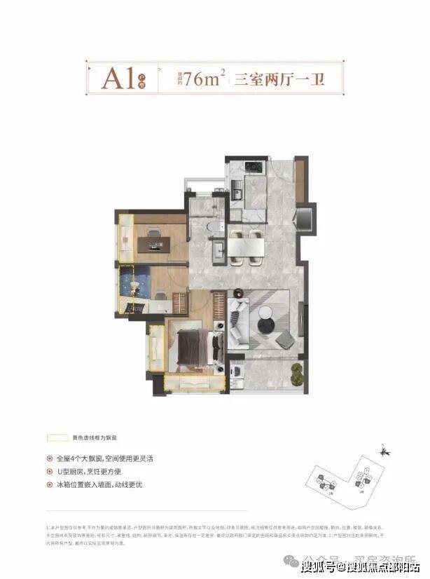 76㎡的3房2厅1卫,设计的是竖厅格局,有设计S型冰箱预留位,主卧双飘窗设计,U型厨房,有西北向,西南向,东南朝向。