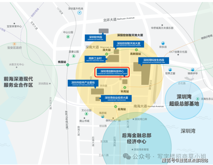 创新科技中心位于全球知名的南山粤海街道核心地带,周边高新技术企业总部集聚,如百度、腾讯、字节跳动、微众银行等企业总部;