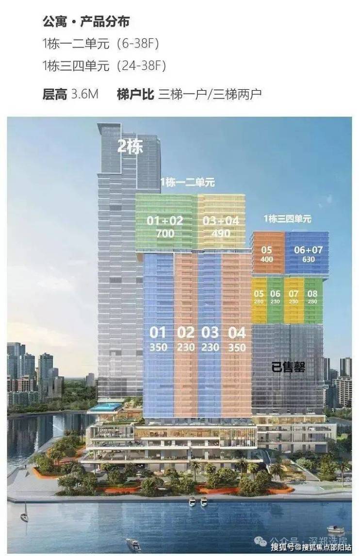 【户型亮点】:双龙抱珠户型设计,户型方正实用,双套房朝南,赏南向一线海景,广角视野景观阳台。高区大户型【一栋 一、二单元】高区(33-38层)三梯一户