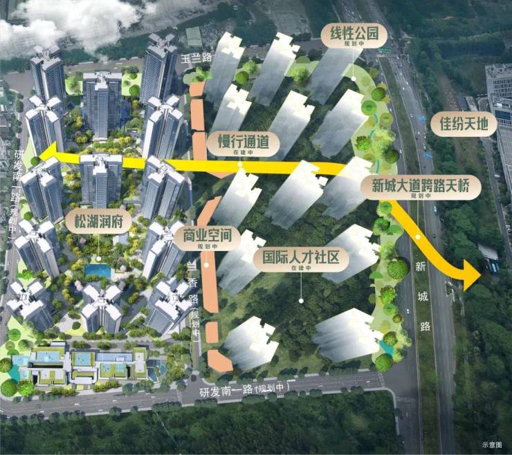 *城市慢行公共廊道——串联人才社区/佳纷天地/松湖烟雨,咫尺繁华商业。*2023年6月7日,华润置地成功中标松山湖科学城国际人才社区项目配套工程代建服务,将配建约2万平米线性公园(规划中),大商业空间(规划中),打造约470米天桥(规划中)链接慢行通道直达佳纷天地、串联松湖烟雨。华润置地以城市运营开发理念、深度参与城市空间建设规划,升级区域配套,再造片区“生命力”。
