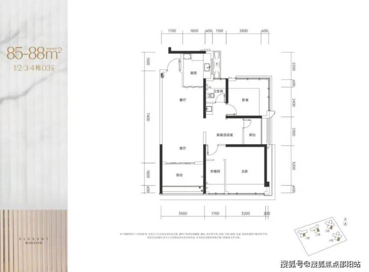85-88㎡的3房2厅2卫,1/2/3/4栋02.03户型,设计的是竖厅格局,客厅3.5米开间,LDKB一体化设计,三开间朝南,3个卧室分别做到了主卧13.43㎡/次卧9.78㎡/次卧6.85㎡(实测面积,去掉墙体),L型厨房,公卫三段式分离,得房率约100-102.68%(包含赠送),东南或西南朝向。