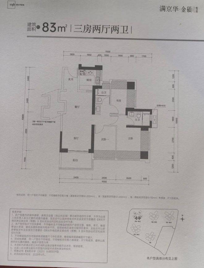 本次推售的是满京华金硕悦府,共由5栋32-48层高的住宅组成,其中1栋1/2单元住宅48F,2栋1单元住宅32F,2栋2单元住宅47F,3栋住宅48F,4栋是1所幼儿园,还配建有社区菜市场,总规划1186户,其中2栋1单元2梯6户,1栋1单元楼王3梯5户,其它栋数全部3梯6户设计。