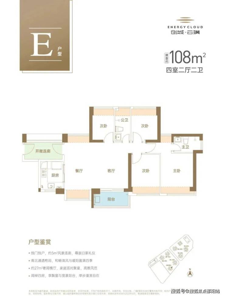108m²的4房2厅2卫,仅2栋4单元03户型才有,进门赠送5.34m²的入户玄关,设计的是横厅南北通透格局,客餐厅5.9米开间,全屋8面飘窗,分别做到了主卧13.73m²/次卧9.53m²/次卧7.47m²/次卧5.75m²(包含墙体飘窗),U型厨房,卫生间干湿分离,得房率74.4%(不加赠送),套内面积80.32m²,阳台东南朝向。