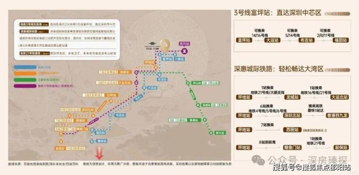 交通配套:创城云璞交通配套极为完善,地铁3号线东延线富坪站已开通,距离项目仅约200-300米,步行10分钟可达。乘坐3号线到大运站可便捷换乘14号线,30分钟直达福田中心区。深惠城际轨道线坪地站预计2026年11月开通,时速160公里,1站到龙城、2站大运北、6站到深圳北、7站到西丽、10站速达前海,实现"1小时湾区生活圈"。