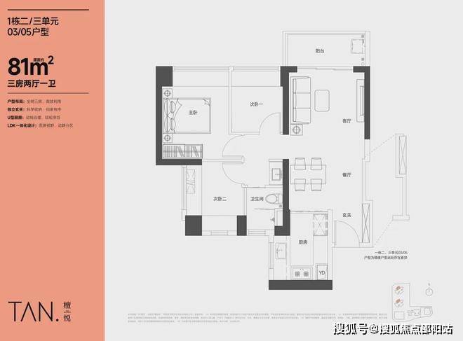 81㎡的3房2厅1卫,设计的是竖厅格局,LKDB一体化设计,进门入户玄关,有1个次卧做的双飘窗,U型厨房,卫生间三段式分离。