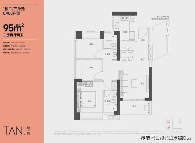 95㎡的3房2厅2卫,设计的是竖厅格局,LKDB一体化设计,进门入户玄关,有1个次卧做的双飘窗,U型厨房,卫生间三段式分离,全部东南朝向。