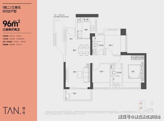 96㎡的3房2厅2卫,设计的是经典竖厅格局,LKDB一体化设计,进门入户玄关,动静分区,三开间朝南,有1个次卧做的双飘窗,U型厨房,全部西南朝向。
