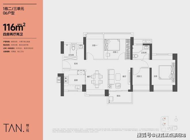 116㎡的4房2厅2卫,设计的是横厅南北通透格局,LKDB一体化设计,进门入户玄关,五开间朝南,超大宽面,主卧南北通设计,U型厨房,阳台主朝东南向。