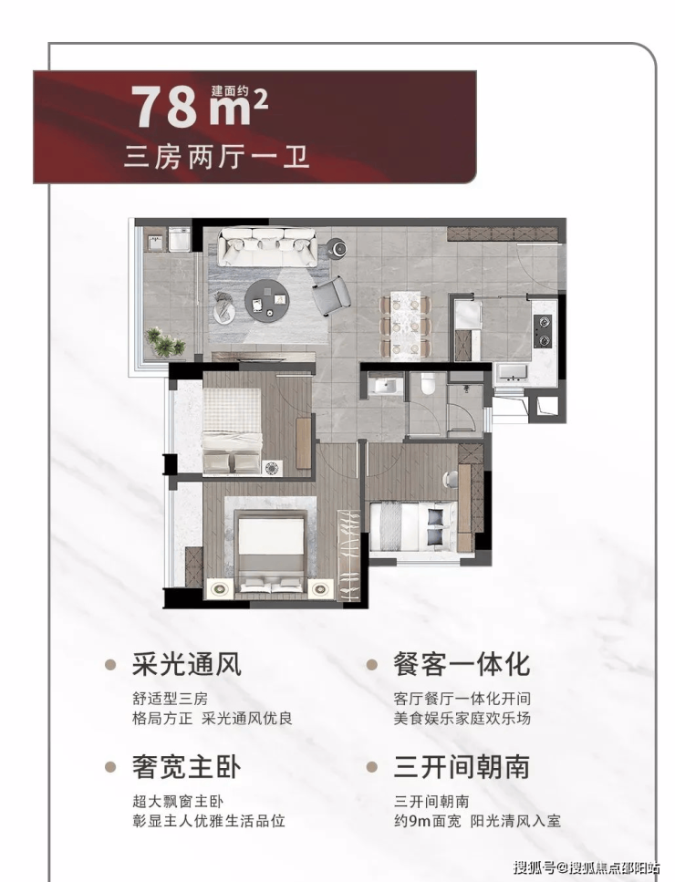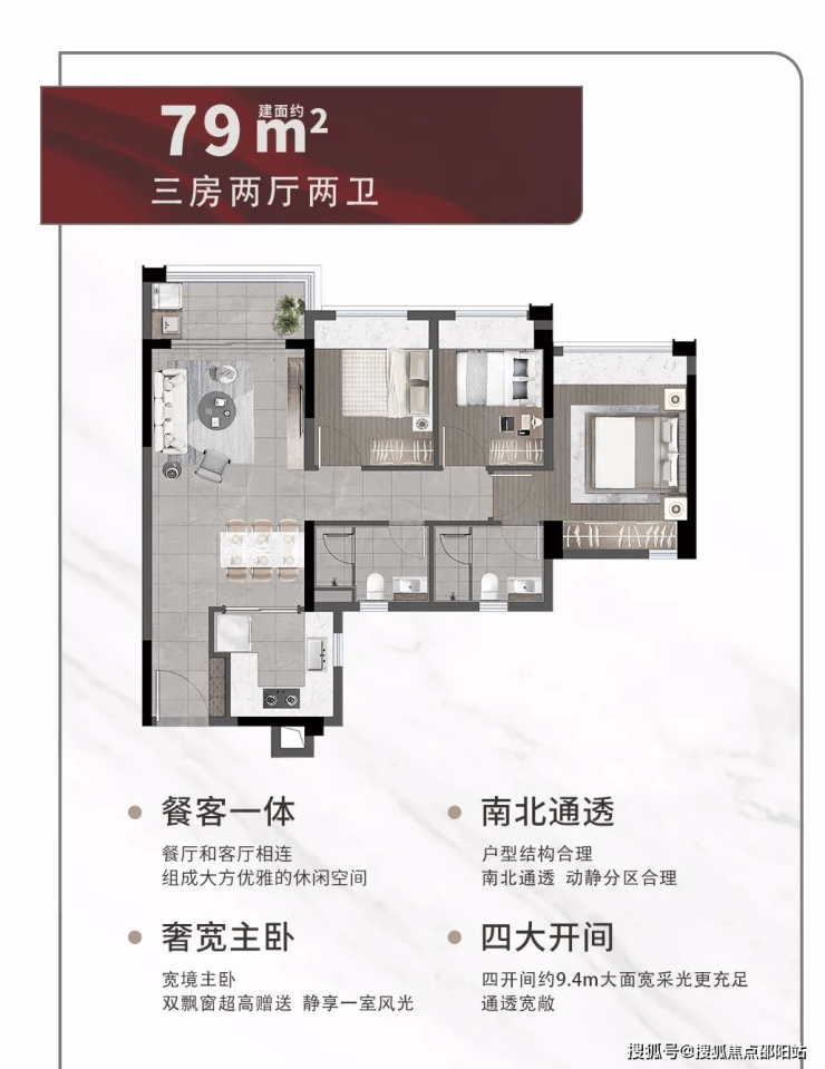3️⃣76-79㎡:三房两卫,三房一卫湖心路最佳景观高层,最高实用率户型