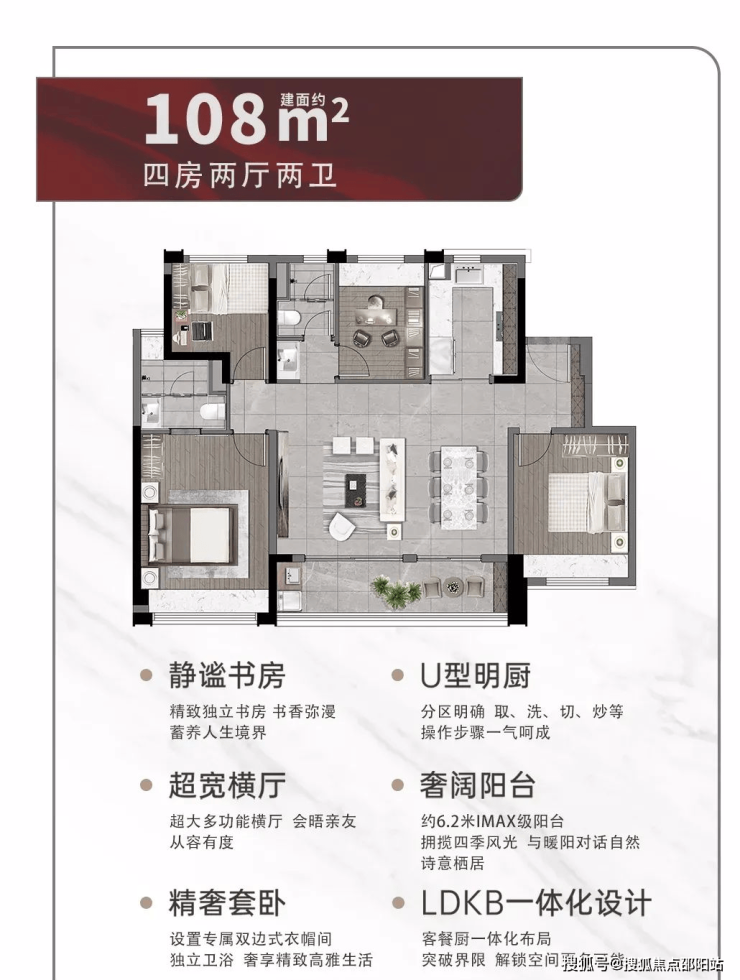 2️⃣108㎡:四房两卫,6.2米大阳台、中轴园林、四房楼王总价180万起