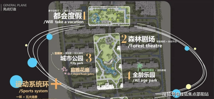 绿色城市花园+庭雅花廊+全龄活动区,城市公园特色;