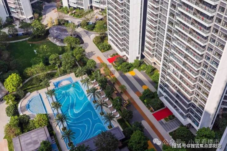 小区泳池两边种了高大的银海枣,颇有海岸度假风情,做了一个超大泳池和儿童池,展现园林优势。