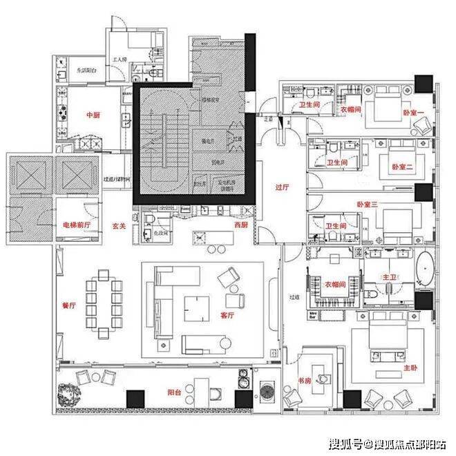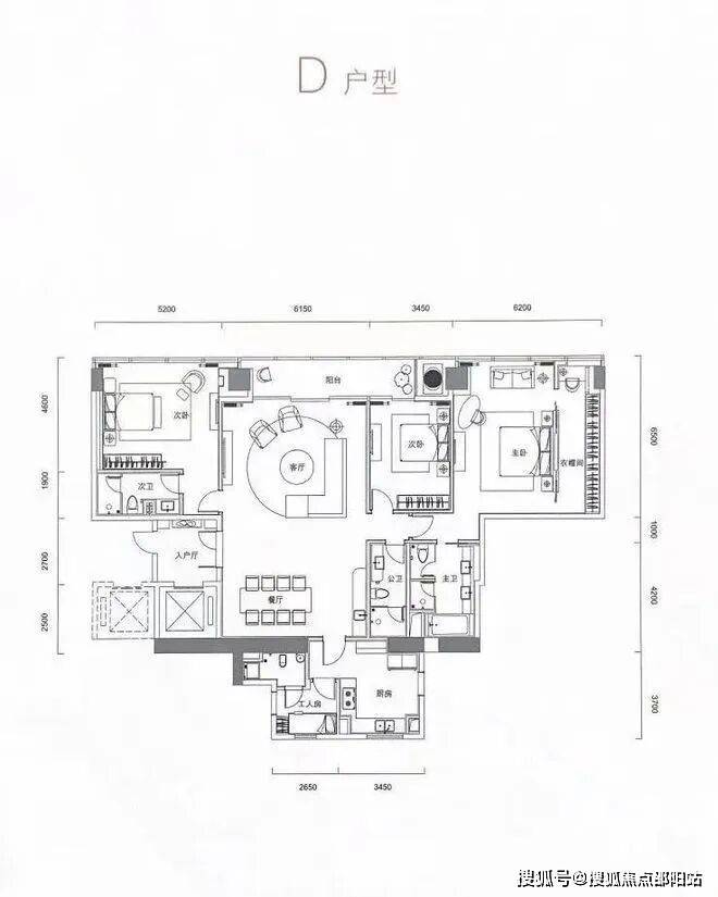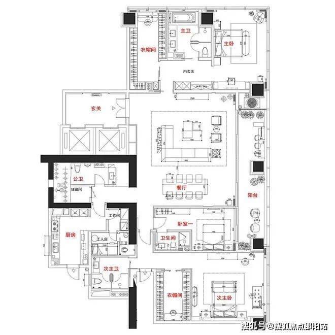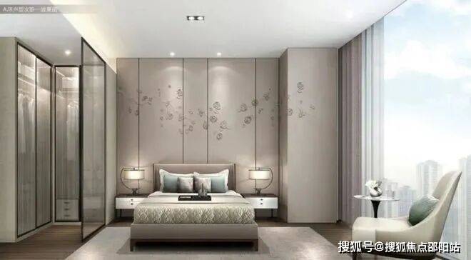 A、B户型,整体是做了动静分离的设计,客餐厅一体化有100平方,中西餐厨设计,有四个套房五卫+1个保姆套房+书房。270° 环幕主卧+全景落地采光玻璃,给你视觉冲击,独立的衣帽间以及一个三分离主卫,也是特别的奢侈。除此之外朝南三开间自西向东分别是老人房,次卧。老人房和次卧都做了全明飘窗,还有一个干湿分离的卫生间,入门一排衣柜。