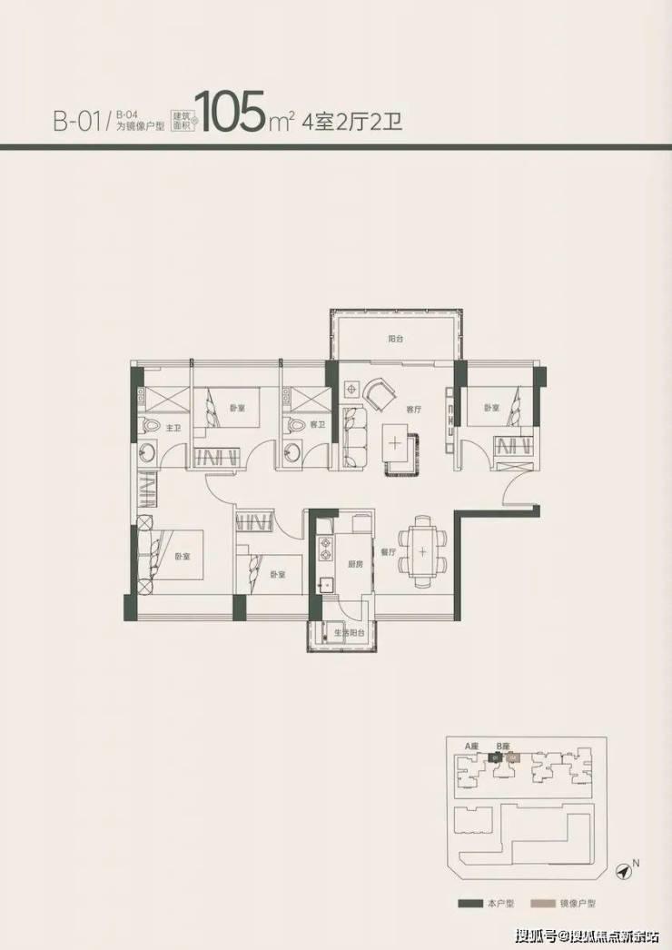 位于1B座是两梯四户的格局,尺度感不亚于目前市面上95㎡的产品。