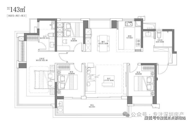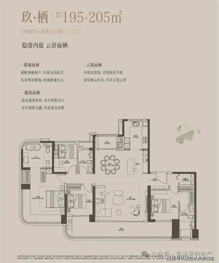 195-205㎡4房3卫:独立电梯入户,中西双厨房,餐客厅一体,双套房设计,端头主卧南北通透,户型方正,四开间朝南,3面采光,整个户型十分通透大气。南北双阳台,餐厅出小阳台,西北向看大运公园山景;客厅出超大观景大阳台,东南向看大运中心。
