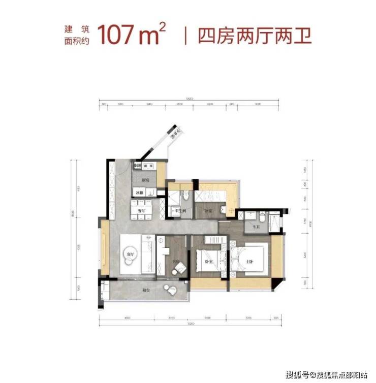 1栋04户型,横厅南北通透,客餐厅5.4米宽,主卧16.02㎡,次卧9.07㎡和8.26㎡(含飘窗)。客厅连次卧,9.3㎡大阳台。得房率79.6%(不含赠送),阳台西南向。含赠送得房率103.55%。建筑面积约107㎡4房2卫