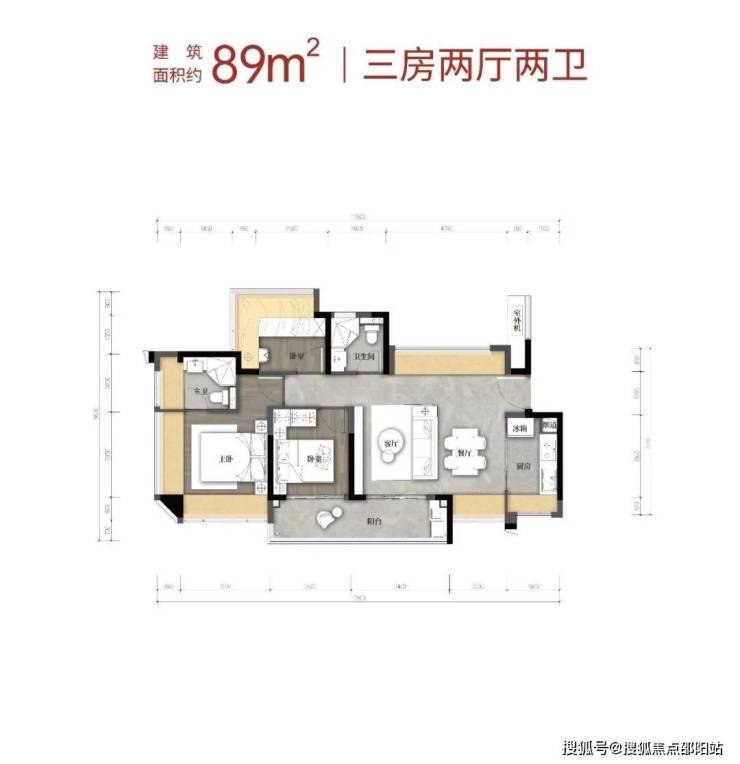 竖厅格局,客厅宽3.3米,S墙预留冰箱位。主卧16.38㎡,次卧8.16㎡和7.84㎡(含飘窗)。得房率79.6%(不含赠送),阳台4.95m²朝东北。含赠送得房率94%。建筑面积约89㎡3房2卫